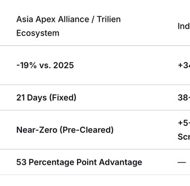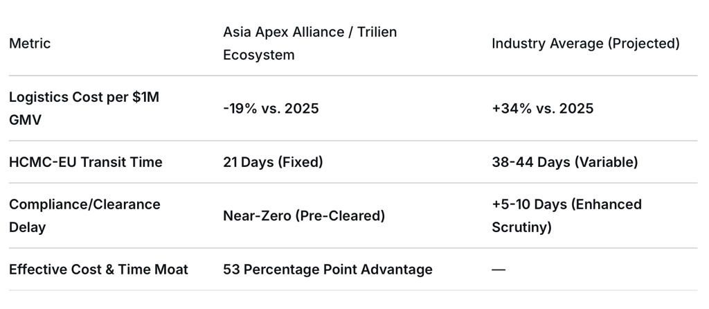 Executive Summary: The coming year will not be defined by a universal increase in logistical difficulty. It will be characterized by a Great Divergence. On one side, operators reliant on generic, commoditized supply chains will face a perfect storm of regulatory surcharges, geopolitical delays, and mandatory digitization they are unprepared to meet. On the other, integrated ecosystems with prescient intelligence and proprietary infrastructure will not only navigate these challenges but convert them into unassailable competitive moats. For the unprepared, 2026 will be a year of cost explosion and margin erosion. For Asia Apex Alliance and the Trilien Group, it is the year our engineered advantages achieve full operational expression.